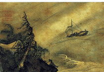 「風濤図」画面全体の大胆な筆遣いと独特な波の形や木の枝葉。荒れ狂う風濤に逆らうような帆船はリアルです。重文。 |