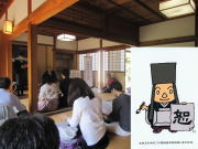 青木文夫先生の講義と素読体験。先生に倣って「子曰、巧言令色鮮矣仁」等と素読。「恕」とは「思いやり」のこと。「中庸」とは・・。 |