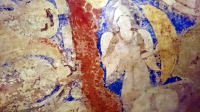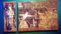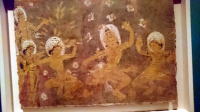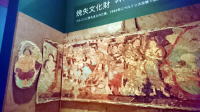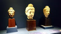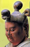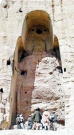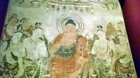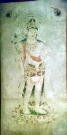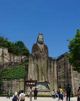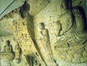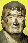 最初は岩に彫刻した表面に朱や金箔がほどこされていた。バーミヤン石仏との類似点からアフガニスタンの僧の彫刻と推理される |