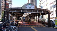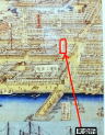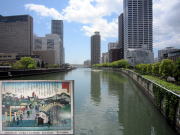 ここは堂島川玉江橋。四天王寺の五重塔を望む名勝で「浪花百景」にも描かれる。大名の蔵屋敷が立ち並んでいた辺りです |