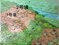 2号墳が一番大きく、大小二つの方墳がくっついた、「前方後方墳」です。高さはあまりありませんが、発掘から、全長32mあることがわかります |