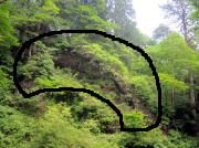 本殿に向かうには山道を登ります。眼下に渓流が流れ、「鞍架け岩」(黒線で囲ったところ)のような奇岩もある素晴らしい景観です |