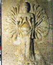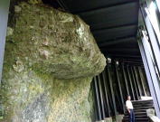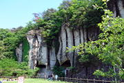 ここ大谷の特産大谷石は軽く柔らかくて加工しやすい。従って浸食も受けやすく「天狗の投石」と名付けられた↑のような奇岩も。 |
