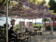 この藤棚の藤はフラワーパークから奉納された「大藤」のこどもだそうです |