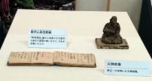 群書類従編纂成就を祈願して「般若心経」を百万回唱える誓いを立てました。上の写真左はその記録帳。右は保己一が大事にしていた天神様の像です。 |