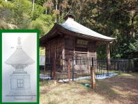開山塔は珍しい木造一重の宝塔で国の重要文化財。写真は覆屋。塔本体のレプリカが「埼玉歴史と民俗資料館」に展示されています。 |