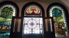 美しいステンドグラスは関東大震災で壊れましたが、設計図も、技術者もまだ健在だったために、昭和2年再建の時に同じものを作ることが出来ました。右は駕籠で街道を行く外国人、左は水路をゆく人々。猿まわしの姿も。 |