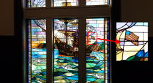 縦3m横1.5mの大きなステンドグラスはペリー来航の図。蒸気船には星条旗が翻っています。戦時中、誰かが布を掛けて隠していた為に、星条旗を理由に破壊されることを免れたのです。戦後接収した進駐軍の兵士も驚いたそうです。 |