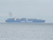 | この日は私達が乗船したころから晴れ始めて、千葉まで見えました。これは中国COSCO社の貨物船 |