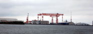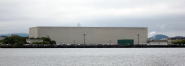 沿岸の大きな建造物。上は住友重工。船も造ります。下は日産の工場 手前に沢山自動車が並んでいます |