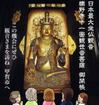 最上階にはご本尊の鴨(おう)台観音さま。お堂の外で、御手に結んだ紐(お手綱)に触ることで観音様に繋がります |