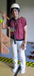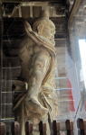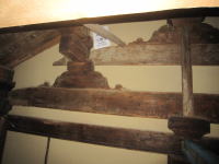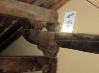 ヘルメットを被りライトを下げて屋根裏へ。↑の蟇股は1226年+αのものと推定されます。1244年の改築時に伐採された部材と思われます。 |