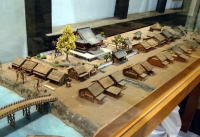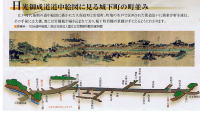 上は「日光御成道道中絵図に見る城下町の町並み。町境の木戸で区画された街道沿に商家が並び、堀と岩槻城が描かれています。 |