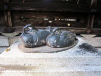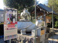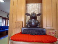 三ツ鳥居は申し込めば参拝できます。↑は申込所の参集殿にあるなで兎。体の悪いところを直してくれます |