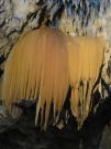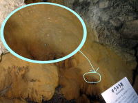 この洞窟のシンボルである、紅白の鍾乳石が向き合っている場所があります。紅の鍾乳石は赤土を含んで色づいた石灰水でできたと思われます。 |