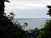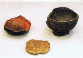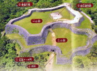 一の郭はまわりを海に囲まれた高台。ここには礎石建物跡があります。屋根瓦は出土していないので屋根は板葺か茅葺だったと思われます。 |