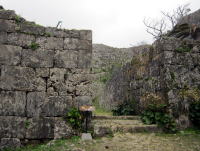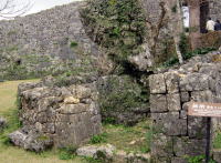 左は石門アーチ上部の楔形石。沖縄で最古のアーチ構造の門と思われる。右は石垣の角。本土内の城の石垣にもみられる算木積みが使われています。 |