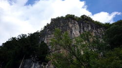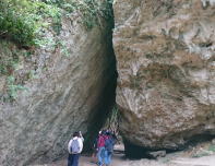 この岩盤の内部が鍾乳洞になっているらしい。とても狭い通路を身をかがめて梯子を登ったり穴をくぐったり。 |