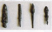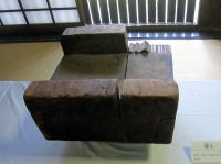 中央の舟形の部材は「肘木」といい、上面に笹繰(ノミ跡)があることから奈良時代のものと考えられます。 |