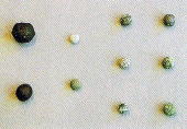 不思議なパワーストーン。両側のそれぞれの石に乗って真中の重りを持ちあげると、右の石の時の方が軽く感じます。 |