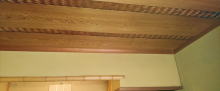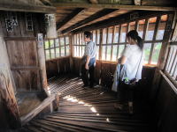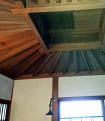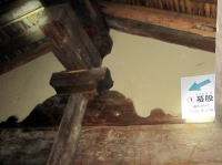 東棟座敷部分は防寒のため天井板で塞がれていますが、玄関側からは茅葺屋根裏の構造を見ることができます。 |