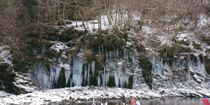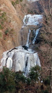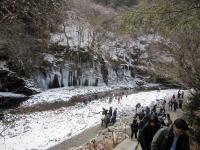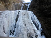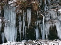 | 岩壁から染み出た水が滴り、凍り、解けた水がまた凍って氷柱になります。幅30m高さ10mほど。水をかけて作った氷柱もありますが、これは天然です |