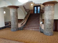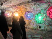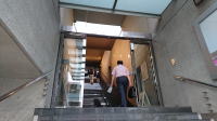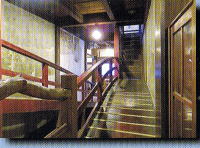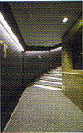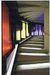 昇り階段の壁には般若心経の一部が、降り階段の壁には千住博氏の絵。一部ガラス窓ごしに反対側の通路が見えます。 |