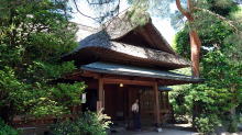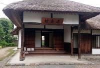 東棟は生家の再興を象徴する茅葺屋根の豪農風建築。亀甲石を三和土に敷いた玄関には式台や控えの間もあり武家風。 |