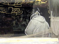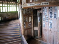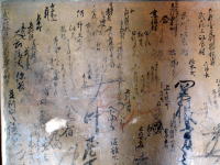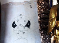 H27~9の大規模修理で壁を覆っていた化粧ボードと塗料の下に墨書が発見されました。各地からの参詣者達が名前や住所、参拝日時、イラスト(左)まで残していました。 |