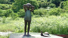 桂木観音に登る途中にあった「テーマ:少女とリス」の像。タイトルは「もういいかい」。帽子からリスの尻尾がはみ出ているのです。 |