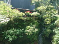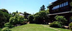 網代戸の門をくぐると手入れの行き届いた広い庭に入ります。右は中棟。門の手前右側には美術館があり、英一蝶、速水御舟、橋本雅邦等のコレクションも。 |