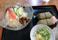 ここは三輪そうめんの里。参道にあるお店で三輪そうめんと柿の葉寿司のセットを頂きました。 |
