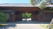 | 長屋門(↑)、渡り廊下で繋がる東棟、中棟、西棟から成る伝統的日本建築は室岡惣七の設計。手前には蓮の咲く濠がある。 |