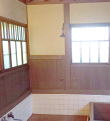 中棟にある浴室。浴槽周囲はタイル張りだが腰から上の壁は木を使い、窓が大きく明るい。天井は蒸気を逃がす構造です。 |