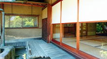 | 茶室には中庭の濡縁からお客様を案内することが出来る。茶室には北山杉、赤松など何種類もの木材を用いている |