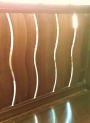板廊下の下部分の灯り採りは波型に開き、柔らかな光が廊下に差し込みます。右のシャッター構造の棚の戸は持ち上げて開けます |