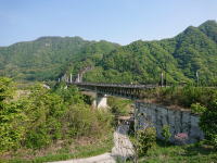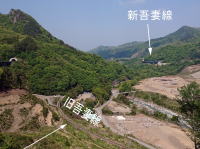 底を走っていた旧吾妻線の線路が下に、新吾妻線の 線路が上に見えます。川原湯温泉駅も、温泉街も右上に移動 |