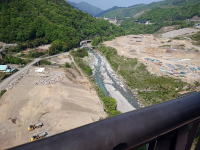 | もうすぐ完成の八ッ場ダム。湛水後はダム底に沈む土地を、今なら不動大橋から眺めることができます。 |