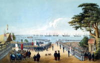 | ペリーに随行してきた画家が描いた「ペリー提督横濱上陸の図」左が応接所、沖合には一列に並ぶ8艘の黒船。 |