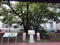 左の絵の右端に見える「たまくすの木」。火事や地震の度に蘇り、公園に隣接する開港資料館に3代目が生きています |