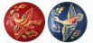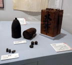 | 上は「海磯鏡」。中国の山を囲み、全体に波と人物(漁師?)の筋彫りが。そして下は着色した象牙の可愛い碁石です。 |