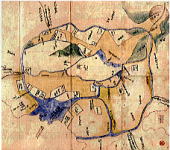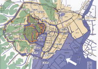 慶長江戸図。左下の紺色部分は日比谷入江、日比谷は江戸初期は海でした。 |