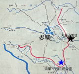 ↑赤い線が石田堤。青☆は鴻巣市に残る石田堤、黒★は三成が利用し、陣をはったとされる丸墓山古墳 |