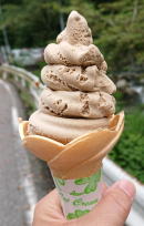 華厳の滝茶屋(左) にはなんと20数種類のジェラートがあるんです。↑は新発売ほうじ茶ジェラートです。じつはこれがお目当て。お茶屋さんは土日のみ開店しています。(コロナ中は窓口販売のみ)) |