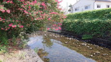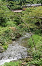 | 四万川の下流に「甌穴(おうけつ)」を見られるスポットがあります。↑は橋の上からの渓流 |