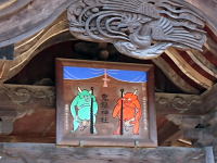 扁額には何だか可愛らしい鬼の絵(右写真)。そして本殿のお賽銭箱の横に、大小様ざまの「金棒」が奉納されています。それって力だめし? |