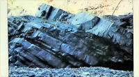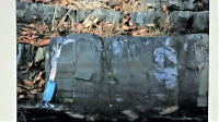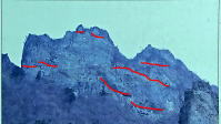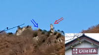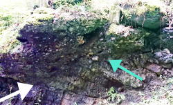 金昌寺は盆地と山地の境界にあり、奥の院の岩山の崖は下部に8500~6500万年前の三波川帯の蛇紋岩(青い矢印の方向の層)、上部に1500万年前の礫岩層が重なり「不整合」(白い矢印の先が境界線)となっています。 |
