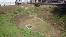 | 狭山市にある「七曲井」。竪堀り技術が発達する前、武蔵野台地ではこのように漏斗状に掘り下げて水を確保しました。平安時代に掘られたものと推定されています。曲がった道を降りて水を汲むので七曲りの井戸です。 |