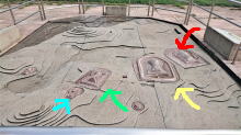 古墳の全体模型。赤は前二子古墳、黄色が中二子古墳、緑が後二子古墳、青は小二子古墳 |
