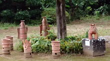 庭の可愛い埴輪群。土蔵を改装した「はにわ館」があり、3D映像で大室古墳群と出土埴輪について学ぶことができます。 |